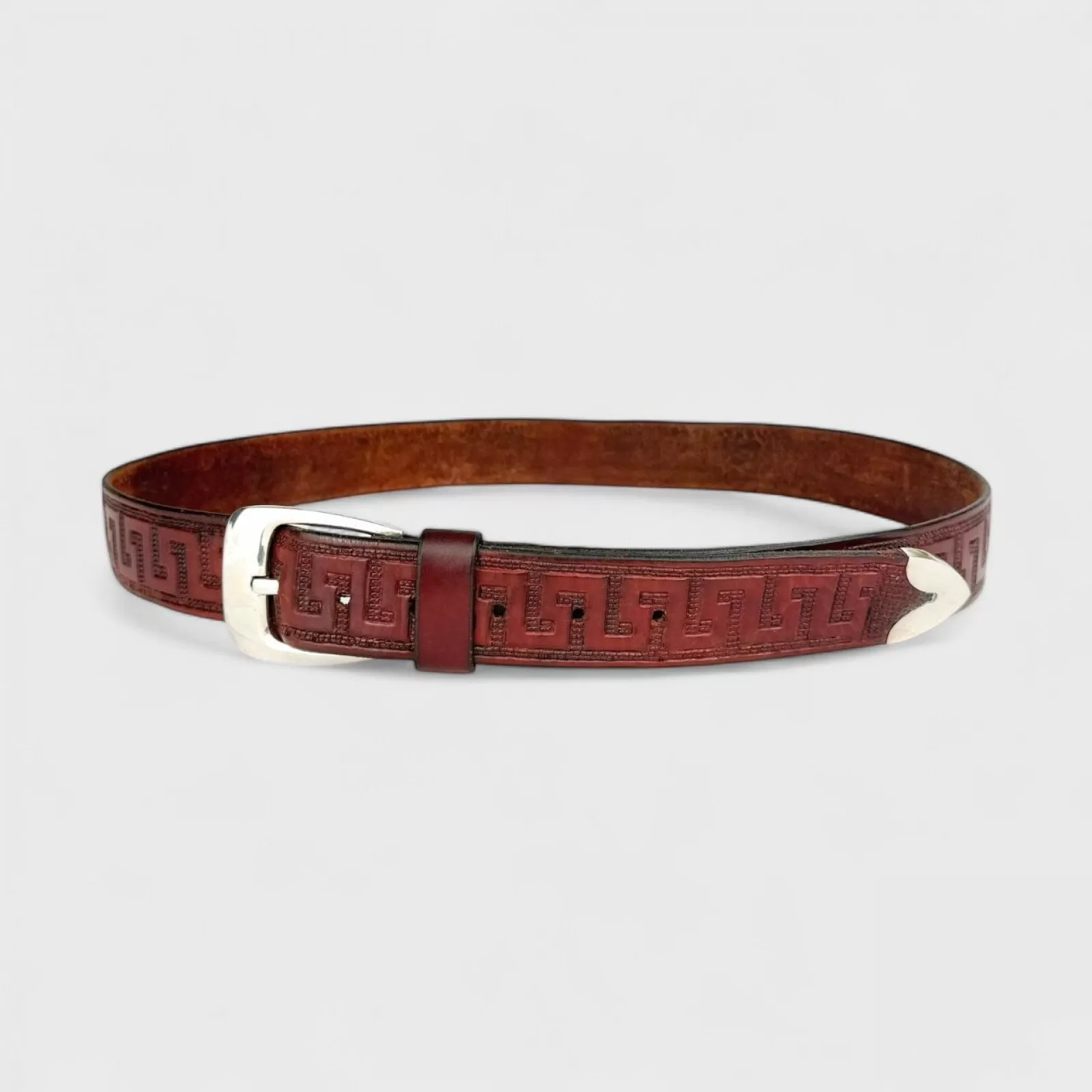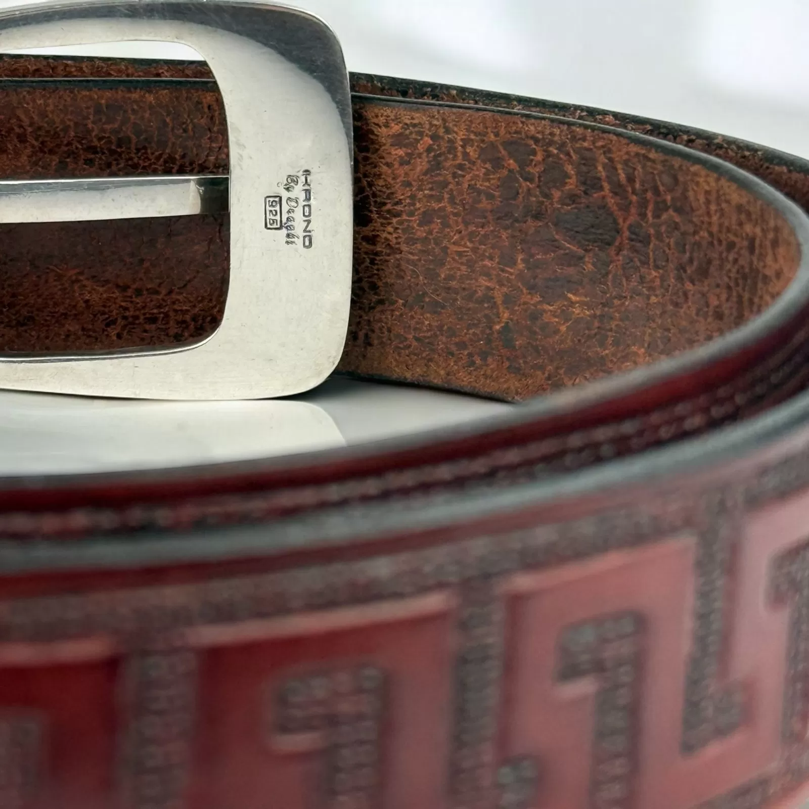 La boucle Draghi est en argent et la ceinture en cuir est gravée d'un motif gaucho.