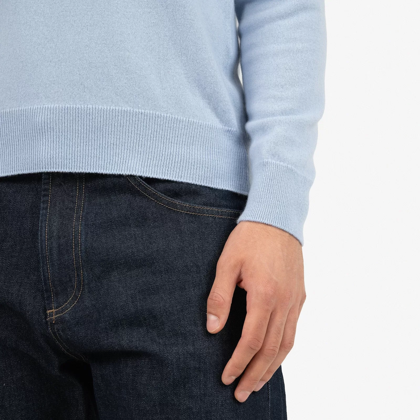 Doté d’un col V épuré et d’une coupe regular harmonieuse, il offre une silhouette fluide et confortable. La teinte bleu clair rappelle les ciels dégagés au-dessus des paddocks, les matinées en bord de mer et les journées calmes entre deux matchs. Frais et intemporel, il se porte facilement sur une chemise ou sous une veste, avec un jean ou un pantalon plus habillé.