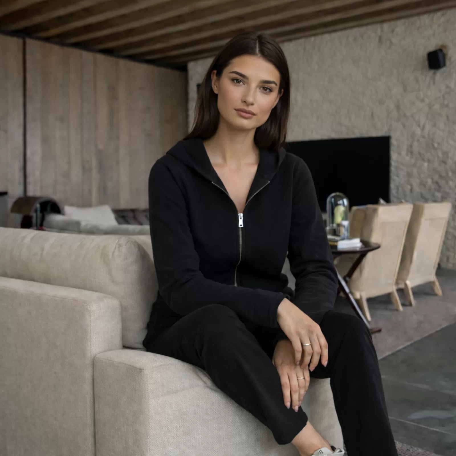 La teinte noire apporte profondeur et sophistication, traversant les saisons et les styles avec une facilité naturelle. Grâce à sa fermeture zippée, ce hoodie s’adapte aux superpositions et accompagne aussi bien les matinées aux écuries que les déplacements, les voyages ou les soirées plus habillées.